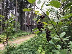 I met my brother Les and his dog Jack (both in the picture) up there. Les had already mowed the lawn / driveway and cooled off by taking a dip in the river by the time I got there. We try to get there once in the summer for this kind of a trip, and this year we were able to coordinate with the peak of the berry crops. Blueberries, raspberries, and chokecherries were all at their height. Highbush cranberries are plentiful this year as well, though they're not nearly ripe yet. The bears had been in the blueberries a little bit (as in the picture below) but it's a good crop this year and we picked a lot: